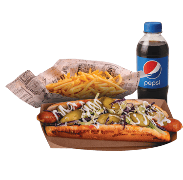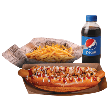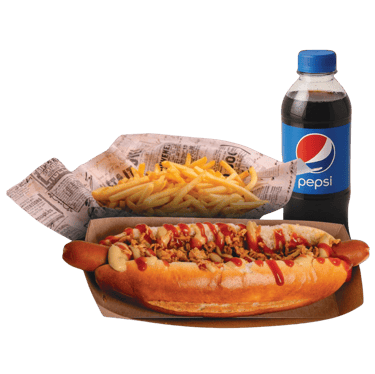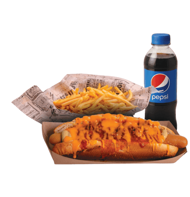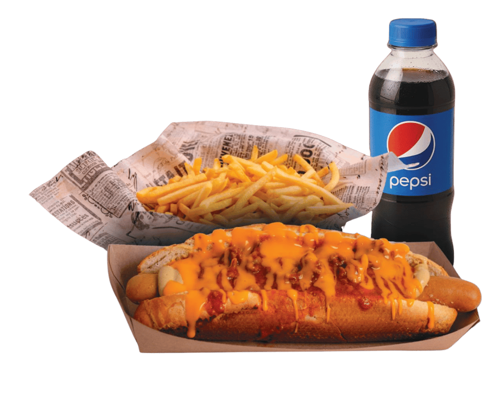 Kad glad zove- combo odgovara! Pileći hot dog s chilli con carne i umakom od sira, krumpirici i piće za pravu foodies kombinaciju.